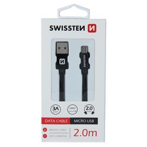 Dátový kábel Swissten MicroUSB Quick Charge 3A 2m Čierny opletený